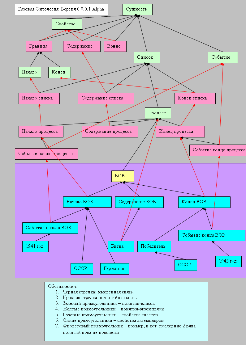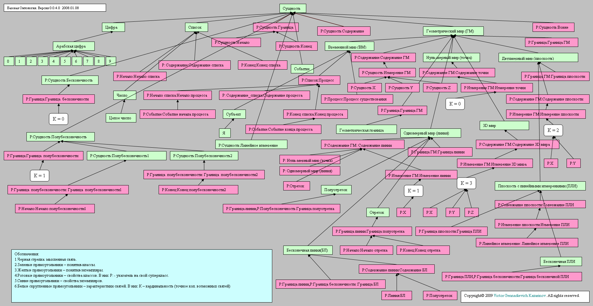 Базовой моя онтология называется потому, что это лишь верхняя, самая абстрактная часть модели мира. Все остальное можно строить на ее основе. Но здесь я описал лишь ее часть. И то там могут быть некот. ошибки.