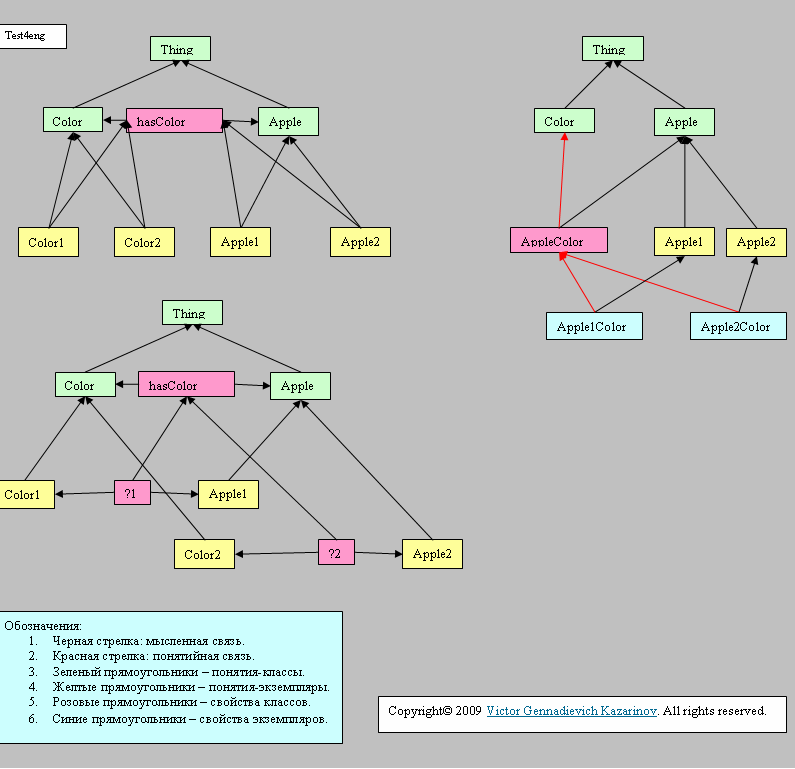 Есть классы: Apple, Color, которые являются субклассами корневого класса Thing. Класс Apple и Color связаны свойством hasColor.Экземпляр Apple1 класса Apple связан с экземпляром Color1 класса Color свойством hasColor. Экземпляр Apple2 класса Apple связан с экземпляром Color2 класса Color свойством hasColor. (см. Test4eng.owl)
