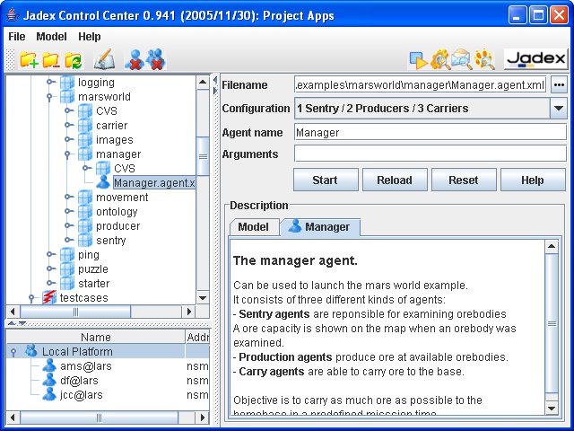 Jadex is a Belief Desire Intention (BDI) reasoning engine that allows for programming intelligent software agents in XML and Java. The resoning engine is very flexible and can be used on-top of different middleware infrastructures such as JADE.